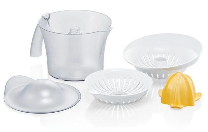 Universalpresskegel für große und kleine Früchte mit Links-und Rechtslauf für hohe Ausbeute. Großer abnehmbarer Saftbehälter mit 800 ml Fassungsvermögen und Mess-Skalierung. Fruchtfleischeinstellung zur Regulierung des Fruchtanteils im Saft. Leichte Reinigung durch spülmaschinengeeignete Teile