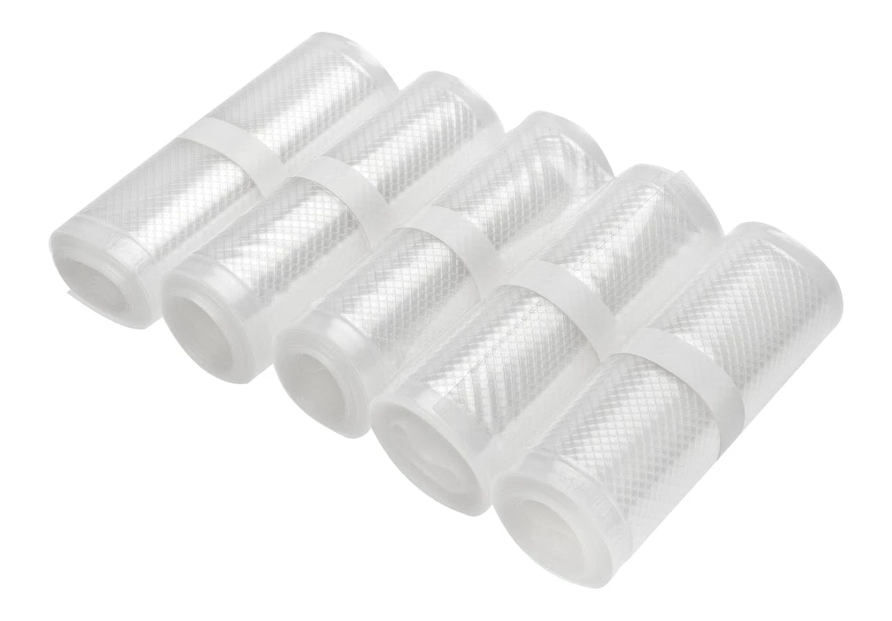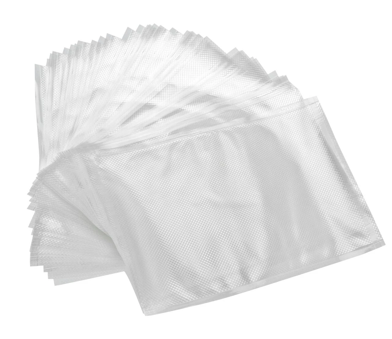 Das Produkt enthält 100 Stück Vakuumbeutel, bestehend aus einer geprägten und einer glatten Seite mit den Maßen 15 x 20 cm (B x L) und einer Dicke von 100 mm auf der geprägten Seite und 90 mm auf der glatten Seite. Die Beutel können Temperaturen von bis zu 100°C für maximal 4 Stunden halten und sind für Schockfrost (-40°C) geeignet.