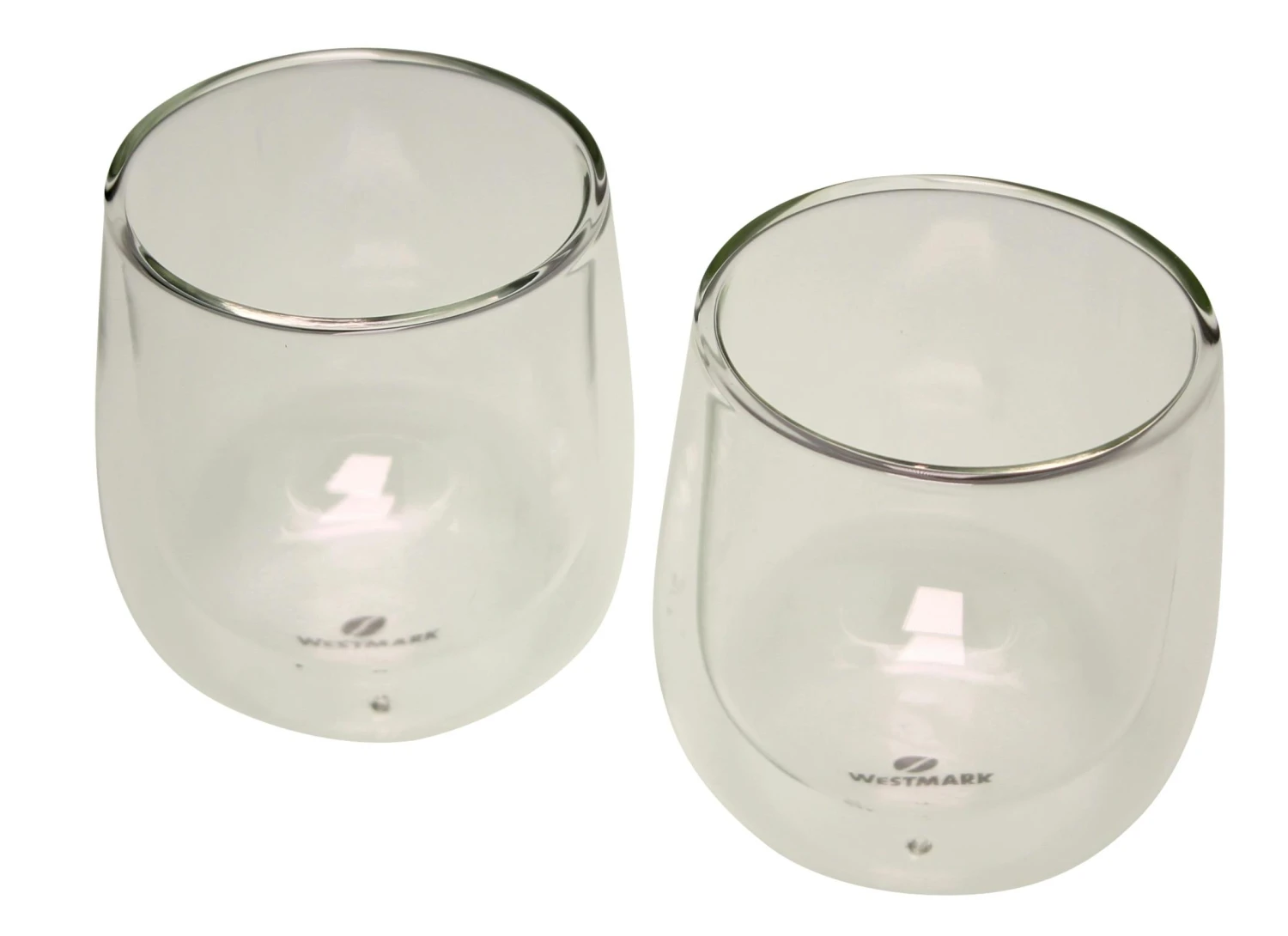 Westmark 24942260 2 Doppelwandige Thermogläser • Füllmenge: 250 ml. • Mikrowellengeeignet • Maße: 90x90x90mm. • Doppelwandiges Borosilikatglas • Mundgeblasenen